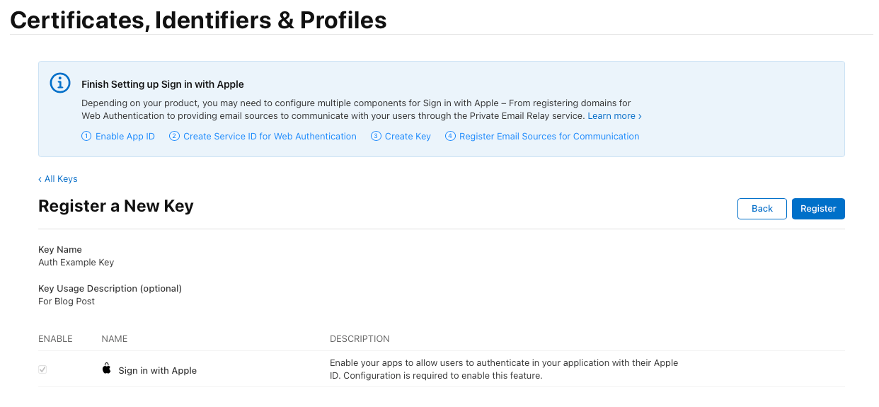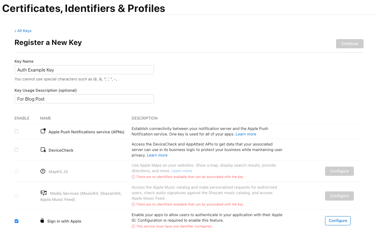 - Enter a Key Name (e.g., “Sign in with Apple Key”).