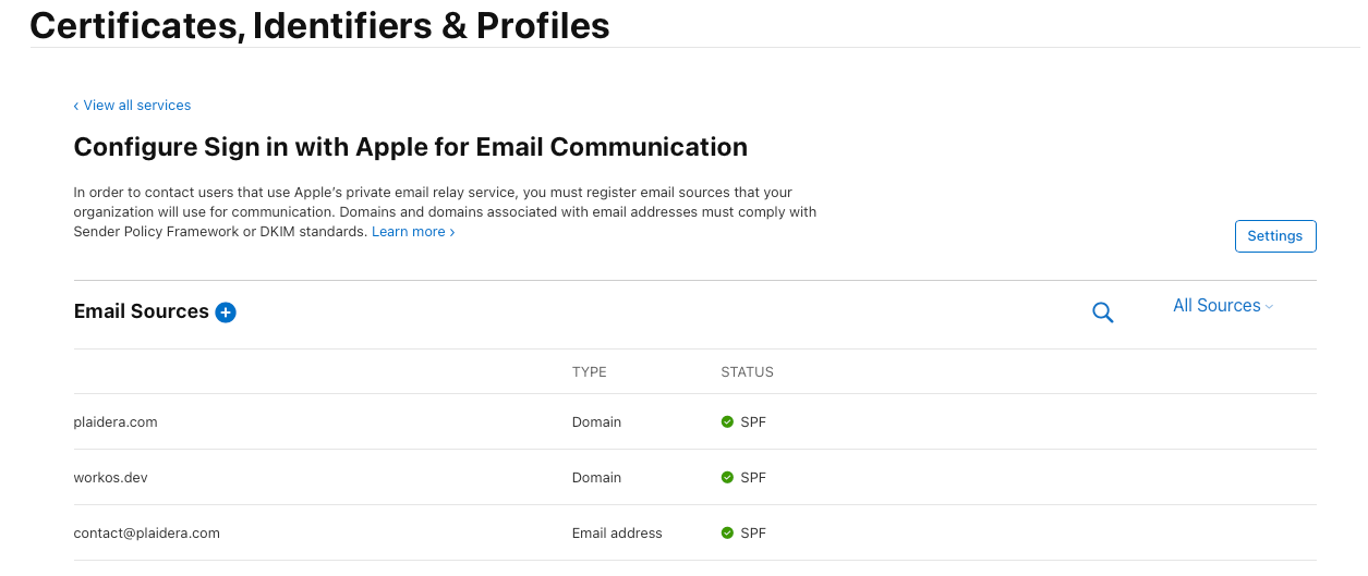 - Navigate to Sign in with Apple settings in WorkOS/Auth0 → Copy the Outbound Email Domains.