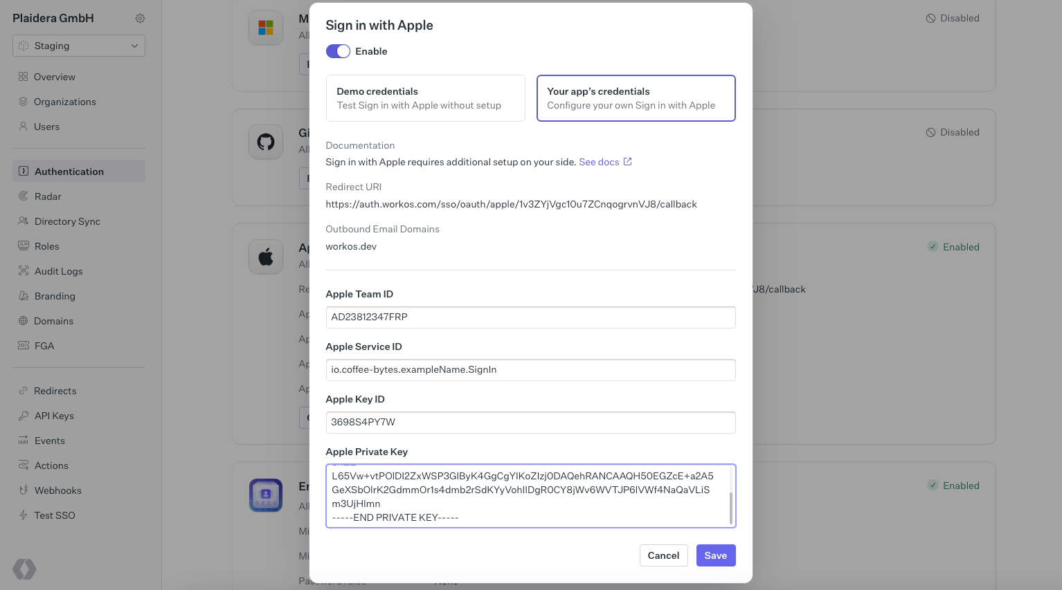 Now that you’ve retrieved the necessary Apple credentials, the next step is to integrate Sign in with Apple into either WorkOS or Auth0. This section provides a step-by-step guide to configuring each platform correctly.