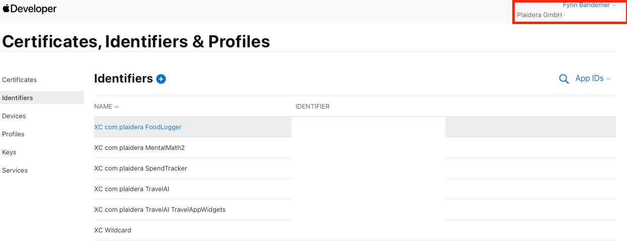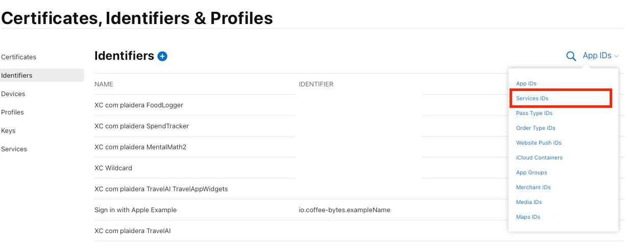 - In the Certificates, Identifiers & Profiles section, click Identifiers.