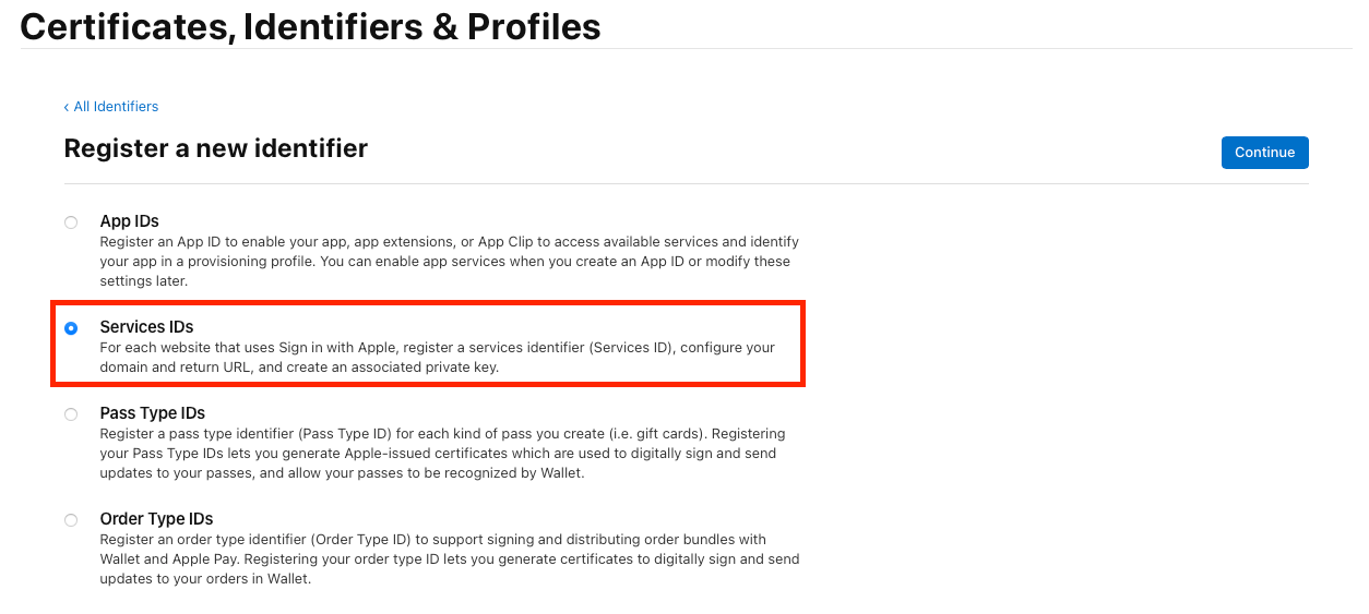 - Select Service IDs → Click Continue.