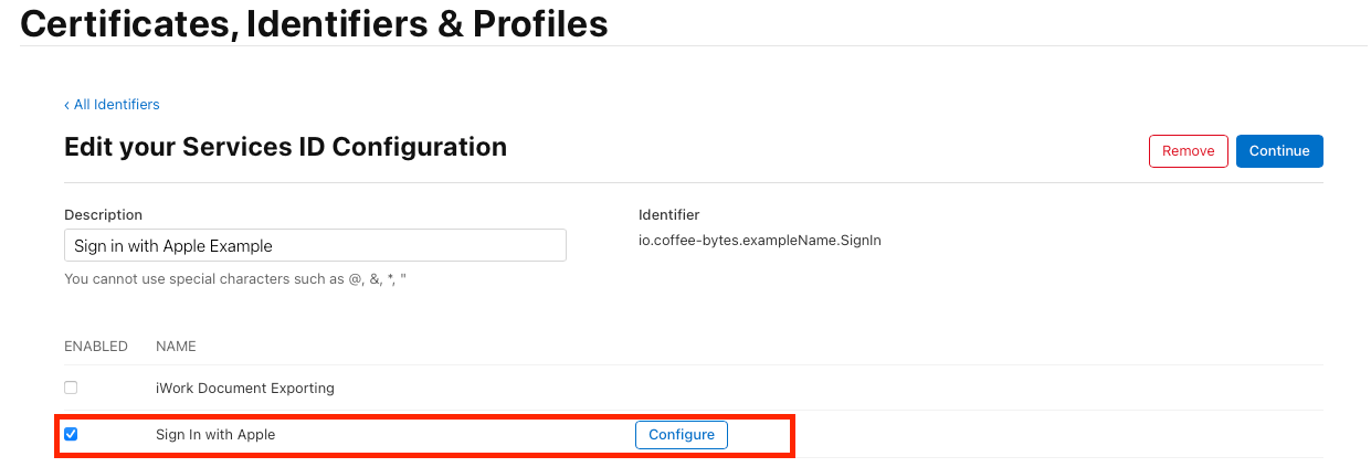 - In your Apple Developer Account, go to Services → Click Sign in with Apple for Email Communication → Click Configure.